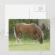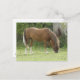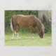 Cette carte postale mignonne présente une belle photo d'un cheval de couleur marron châtaigne magnifique à crinière brune et pieds blancs. Le cheval broute sur une herbe verte courte dans un champ.