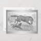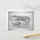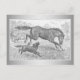Charmante illustration vintage en noir et blanc d'un chien noir pourchassant un cheval. Le cheval est galopant et il y a une ferme de campagne et la vache dans l'arrière - plan. Placé dans un cadre gris argenté à deux tons.
