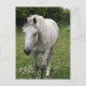 Cheval gris errant dans un champ avec de minuscules fleurs.