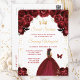 Cette invitation élégante et glamour pour un anniversaire de seize ans présente une belle princesse avec des cheveux bruns dans une robe de bal rouge bourgogne. Le texte combine une écriture manuscrite et des polices modernes sans serif pour un look classe et sophistiqué. Les arrangements floraux, le papillon et les confettis dorés créent le mélange parfait de rustique et de chic.