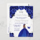 Cette invitation d'anniversaire élégante et glamour pour un sweet sixteen présente une belle princesse aux cheveux bruns dans une robe de bal bleu foncé. Le texte combine une écriture manuscrite et des polices sans empattement modernes pour un look classe et sophistiqué. Les arrangements floraux, le papillon et les confettis argentés créent le mélange parfait de rustique et de chic.