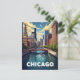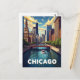 Celebrate the architectural beauty of Chicago, USA, with this dynamic vintage-style postcard featuring the city's iconic river and skyline. The design captures a boat cruising down the river, framed by towering downtown buildings and a vibrant sky. This travel poster is perfect for lovers of US cities, urban architecture, and river cruising. Ideal for sending greetings, keeping as a keepsake, or framing as stylish wall art.