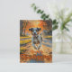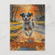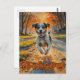 Célébrez la saison de la gratitude avec ce design dynamique, avec un chien joyeux qui saute à travers une scène d'automne pittoresque, avec des couleurs chaudes d'automne et un message chaleureux de "Bon thanksgiving".