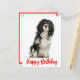 Cette carte postale canine amusante présente l'image d'un chien chiot Cavalier King Charles Spaniel noir, marron et blanc surligné contre un arrière - plan blanc immaculé avec Happy Birthday imprimé dans une police manuscrite noire.