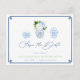 Le design classique de la carte postale "Save The Date" est composé d'un vase en pot de gingembre bleu et blanc peint à la main, dont le centre est rempli de fleurs d'aquarelle. J'ai configuré le modèle pour un mariage Enregistrer la date mais tous les champs de texte sont entièrement flexibles. A l'exception des fleurs et des feuilles, tous les éléments d'aquarelle ont été peints à la main par moi avant d'être scannés sous forme numérique et arrangés en motif extensible. Vous pouvez changer la couleur de la bordure de la clé grecque sur le devant en n'importe quelle couleur que vous voulez en changeant simplement la couleur arrière - plan à l'intérieur de l'outil de conception (cliquez / touchez pour "personnaliser davantage" pour accéder à l'outil de conception).