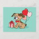 Un chiot joyeux avec un cadeau et des ballons à l'arrière-plan bleu.