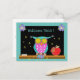 Une carte postale mignonne et joyeuse pour accueillir les élèves de maternelle à l'école. L'avant de la carte postale est orné d'une chouette colorée devant un tableau noir et à côté d'une pomme rouge. En haut, on peut lire "Bienvenue !". Au verso se trouve un modèle texte avec toutes les informations pour le premier jour de l'école. Modifiez-le pour répondre à vos besoins. Il y a aussi une ligne pour ajouter le nom de l'enseignant et le numéro de la chambre. © ArianeC Illustrations
