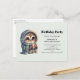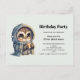Invitation à la carte postale pour la fête d'anniversaire avec une jolie illustration d'un chouette en robe d'hiver et d'un foulard tenant un café chaud.