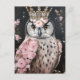Carte Postale Chouette neige avec couronne d'or et fleurs roses