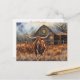 Longhorn cow with an ornament on his horn and a cute, decorated barn. A fun country western postcard.