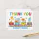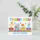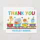 Cette adorable carte de remerciement d'anniversaire pour cirque présente des animaux de zoo en safari. Le train contient une girafe, un éléphant, un tigre et un hippopotame mignon au-dessus du monogramme de vos enfants écrit sous des couleurs orange, verte, rouge et bleue.