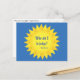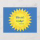 Cette carte postale présente une citation du pape François sous un soleil jaune sur un arrière - plan bleu. Les couleurs font partie des armoiries du souverain pontife. Le texte dit : Qui suis-je pour juger ? C'est un exemple de la grandeur et de l'humilité de cet homme très spécial.