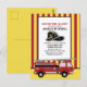 Carte postale d'invitation à une fête d'anniversaire de 5 ans pour un enfant avec camion de pompiers rayé rouge et jaune / pompier. Le texte dit : « Sonnez l'alarme, ENFANTNOM a 5 ans. » Ajoutez vos propres instructions en bas. Les nôtres disent : « Apportez des vêtements de rechange. Nous allons nous mouiller. »