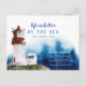Beautiful watercolor new home announcement featuring a coastal red & white lighthouse with a dark blue watercolor wash.