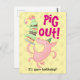 Un cochon heureux sur une carte postale d'anniversaire. Utilisez "Personnaliser ce modèle" pour modifier le texte "PIG OUT ! C'est votre anniversaire !" et créer un message unique et personnalisé. Une carte présentant un cochon joyeux, sous un gâteau à étages bancal avec des rubans de glaçage vert et surmonté de bougies roses.