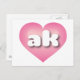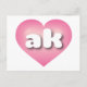 Cette carte postale est composée d'un coeur rose et calme, cool et ramassé, avec un centre blanchi à la chaux contenant des lettres coques en chêne, blanches, arrondies et en bas, une abréviation ludique pour l'état de l'Alaska, la dernière frontière. Le verso de la carte est vide, en attendant vos sentiments manuscrits ou le texte customisé.