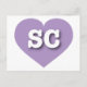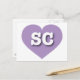 Cette carte postale présente un coeur de lavande contenant les lettres coques supérieures et chaudes SC, l'abréviation officielle pour la Caroline du Sud, l'état de palmetto. Le verso de la carte postale est vide, en attendant vos sentiments manuscrits ou le texte personnalisé.