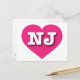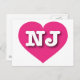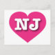 Cette carte postale est dotée d'un coeur rose vif et chaud contenant les lettres coques en haut et en blanc NJ, l'abréviation officielle du New Jersey, l'état du jardin. Le verso de la carte postale est vide, en attendant votre texte customisé ou vos sentiments manuscrits.