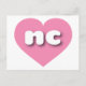 Cette carte postale est dotée d'un coeur rose vif contenant les lettres coques inférieures blanches et arrondies nc, une version ludique de l'abréviation pour la Caroline du Nord, l'état du talon de goudron. Le verso de la carte postale est vide, en attendant votre texte customisé ou vos sentiments manuscrits.
