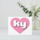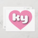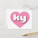 Cette carte postale est dotée d'un coeur rose vif contenant les lettres coques inférieures, blanches et arrondies et audacieuses, une abréviation amusante pour le Kentucky, l'état de l'herbe bleue. Le verso de la carte postale est vide en attendant vos sentiments manuscrits ou le texte customisé.
