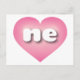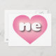 Cette carte est dotée d'un coeur rose avec un centre lavé blanc contenant des lettres coques inférieures en gras, arrondies et blanches, une version ludique de l'abréviation pour Nebraska, l'état cornhusker. La carte est vide à l'intérieur en attendant votre texte customisé ou vos sentiments manuscrits.
