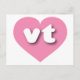 Cette carte postale est composée d'un coeur rose cool et calme contenant les lettres coques basses arrondies et audacieuses vt, une abréviation ludique pour Vermont, l'état de montagne vert. Le verso de la carte postale est vide, en attendant vos sentiments manuscrits ou le texte customisé.