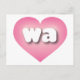 Cette carte postale présente un coeur rose avec un centre blanchi contenant les lettres coques inférieures arrondies et audacieuses wa, une abréviation ludique pour Washington, l'état à feuillage persistant. Le verso de la carte est vide, en attendant vos sentiments manuscrits ou le texte customisé.