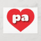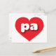 Cette carte postale est dotée d'un coeur rouge vif contenant des lettres coques inférieures blanches et arrondies, pa, une abréviation ludique pour la Pennsylvanie, l'état de la pierre angulaire. Le verso de la carte postale est vide à l'intérieur en attendant votre texte customisé ou vos sentiments manuscrits.