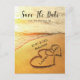 Rejoignez-nous pour un mariage de destination. Envoyez les cartes postales Save the Date pour informer vos invités de bloquer la date pour votre mariage dans le futur proche. Il y a une scène de plage avec deux coeurs tirés dans le sable et l'océan s'écrasant sur le sable. Vous pouvez facilement personnaliser avec vos informations.