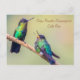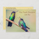 Carte postale avec deux colibris à gorge violente, vert, orange et jaune, perchés ensemble, l'un avec son bec ouvert comme pour parler à l'autre, au Costa Rica. Photo prise au Paraiso Quetzal Lodge, San Gerardo de Dota, Costa Rica.