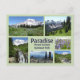 Carte postale avec photos prises au Paradise dans le parc national du Mont Rainier. Inclut des photos de Paradise Inn, Myrtle Falls, fleurs sauvages, et vues de Rainier et de la chaîne Tatoosh.