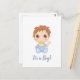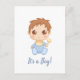 Mignon bébé de dessin animé habillé d'une combinaison bleue avec une bib jaune tenant un hochet.