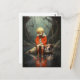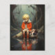 Un jeune garçon dans une veste rouge est assis sur un rocher par un plan d'eau réfléchissant et tranquille, accompagné de son chien. Le garçon semble attristé et son fidèle compagnon est en train de le compatir. Le décor est installé dans une forêt mystique à l'ambiance tranquille. Photoshop Art numérique CS5