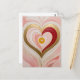 This is an abstract, symmetrical painting centered on a large heart motif that radiates outwards in concentric layers. The color palette is dominated by soft shades of pink and white, creating a gentle, flowing background texture that suggests organic movement or energy fields. The heart is defined by alternating bands of color, prominently featuring luminous gold leaf and a deep, solid red accent on the upper right side. The core of the heart is marked by a bright, yellow circle surrounded by smaller concentric rings. Delicate gold lines outline the major bands, emphasizing the structure and contributing to a sense of luxury and spiritual geometry. The overall composition is harmonious and uplifting.