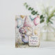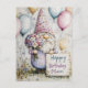 Cette image touchante présente un gnome charmant vêtu d'un chapeau festif, tenant un bouquet de fleurs colorées et un panneau qui dit "Joyeux Anniversaire Maman". Entouré de ballons joyeux et niché dans un jardin fantaisiste, ce gnome adorable dégage une sensation de chaleur et de joie.