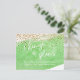 Ce design lumineux et festif peut être ce que vous cherchez si vous voulez une carte unique pour avertir votre tribu que votre mariage a été retardé. Dans une police amusante et manuscrite, j'ai créé un graphique qui dit "Changement de plan". Ci-dessous, un message que vous pouvez customiser à votre propre libellé. Mon texte dit : "Nous nous marions toujours... Maintenant, nous ne savons simplement pas quand !" L'arrière - plan est décoré d'un trait d'aquarelle gras dans les tons vert vif. En superposant cela, les faux confettis de couleur or semblent tomber d'en haut. Utilisez les champs modèle pour ajouter vos propres détails et la messagerie préférée. // 129 //