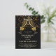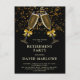 Verres à champagne et rubans dorés avec confettis dorés sur fond noir avec texte blanc, invitation carte postale pour une fête de départ à la retraite. Une invitation tendance dorée et noire avec des verres à champagne scintillants. Personnalisez avec les informations de votre fête. Parfait pour un homme ou une femme.