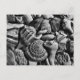 Carte postale en coquillages noir et blanc. Cette image de coquillages comprend un cadran solaire, un buccin éclair, un oursin, une coquille de vers et des morceaux de coquillages qui fournit des formes et des textures intéressantes. Vierge sur le dos à utiliser pour n'importe quelle occasion.
