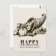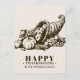 Fêtez Thanksgiving cette année avec cette carte postale unique. Il présente une illustration de style vintage d'une corne remplie de fruits et de légumes. Symbole classique d'une fête d'Action de grâces. Il est assis sur une toile de fond claire et brun avec vos détails dans une couleur marron noyer similaire à l'illustration. N'oubliez pas que vous pouvez également utiliser le transfert de cette fonctionnalité de conception pour transférer cet article à plus de 500 produits différents. Cela dit, aimez être créatif et faites-le vous-même.