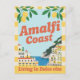 Capturez l'essence du charme italien avec cette carte postale exquise de la côte d'Amalfi, inspirée des classiques affiches de voyage rétro ! Cette illustration vintage vibrante donne vie à la beauté époustouflante de la côte d'Amalfi, en Italie, avec ses villages pittoresques perchés sur les falaises et la mer Méditerranée scintillante d'un bleu éclatant. Ornée de branches de citronniers luxuriantes et encadrée d'une bordure rayée joyeuse, ce design incarne véritablement l'expression "Vivre la Dolce vita".