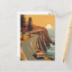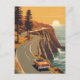 Promenez-vous pittoresque le long de l'emblématique Pacific Coast Highway en Californie avec cette carte postale de voyage de style vintage. Avec ses routes sinueuses le long de falaises spectaculaires, son décapotable de croisière et l'océan Pacifique au coucher du soleil, cette illustration capture l'esprit du voyage routier américain ultime. Un incontournable pour les collectionneurs comme pour les amateurs de voyage.