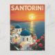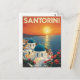 Cette belle carte présente une illustration de style vintage de l'île grecque emblématique de Santorin. Le design capture les célèbres bâtiments blanchis à la chaux avec leurs dômes bleus, le tout face à un coucher de soleil sur la mer Egée. Les couleurs chaudes et vives et la typographie rétro lui donnent l'impression d'une affiche de voyage classique, en faisant un parfait souvenir d'un voyage ou un accueil pour tous les amoureux du voyage et du charme méditerranéen.