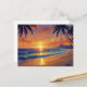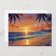 Oeuvre d'un coucher de soleil sur une plage tropicale. Les vagues et le sable brillent dans la lumière dorée. Il y a des silhouettes de palmiers.
