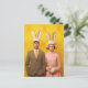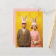 Un homme et une femme rétro avec une expression sérieuse du visage, portant des oreilles de lapin sur la tête et elle tient des oeufs de pâques de couleur pastel