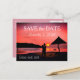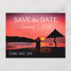 Une carte postale "Save the date" avec un couple aimant sur la plage au coucher du soleil.