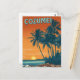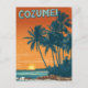 Ce poster vintage nostalgique saisit la beauté tropicale de Cozumel au coucher du soleil. Les palmiers s'avancent doucement sur une plage tranquille, tandis que le soleil se couche à l'horizon, projetant des teintes chaudes orange et rose dans le ciel. Avec des textures rétro et une palette de couleurs assombries, l'oeuvre évoque le charme décontracté des escapades insulaires du milieu du siècle, parfait pour les amateurs d'art de voyage vintage et d'escapades caribéennes.