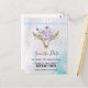 Une carte postale de sauvegarde de date avec un fond aquarelle turquoise et pastel. Un crâne d'animal bohème chic avec un bouquet floral sur la tête et de petits papillons voltigeant autour. Une bordure décorative mignonne avec de petites formes de gouttelettes en bleu clair.
