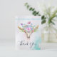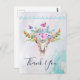 Carte de remerciement avec un message personnalisé au verso. Conçue avec un fond aquarelle turquoise et pastel. Un crâne d'animal boho chic avec un bouquet floral sur la tête et de petits papillons voltigeant autour. Une bordure décorative mignonne avec de petites formes de goutte en bleu clair.
