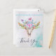 Carte de remerciement avec un message personnalisé au verso. Conçue avec un fond aquarelle turquoise et pastel. Un crâne d'animal boho chic avec un bouquet floral sur la tête et de petits papillons voltigeant autour. Une bordure décorative mignonne avec de petites formes de goutte en bleu clair.