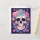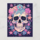 Une carte postale frappante avec un crâne orné de fleurs vives et entouré d'étoiles, parfait pour ceux qui apprécient un mélange de macabre et de beau.